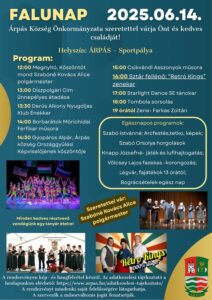 Árpás Község Önkormányzata szeretettel várja Önt és kedves családját! Időpont: 2025.06.14. Helyszín: ÁRPÁS – Sportpálya Program:12:00 Megnyitó. Köszöntőt mond Szabóné